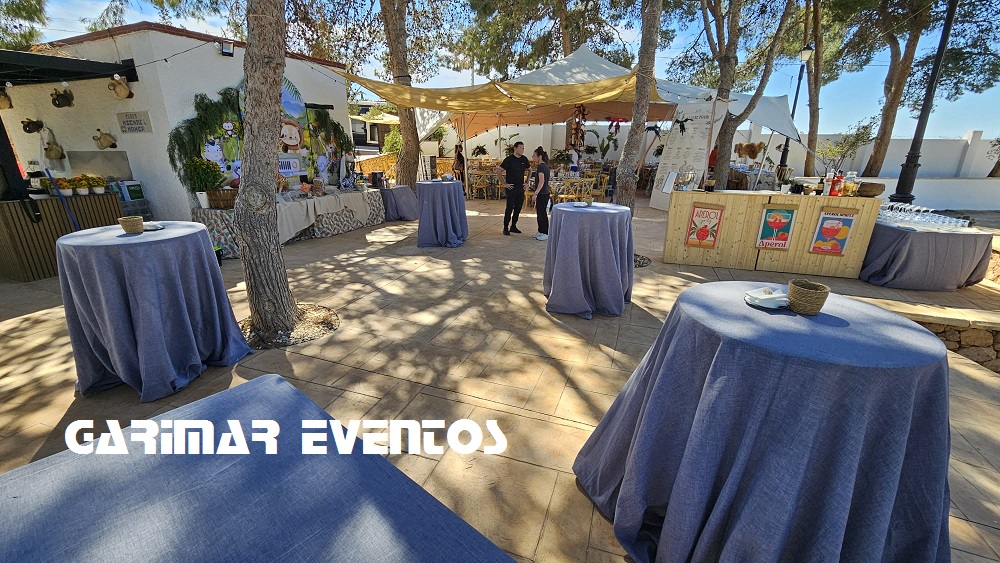 Mesas altas con manteleria extralarga.